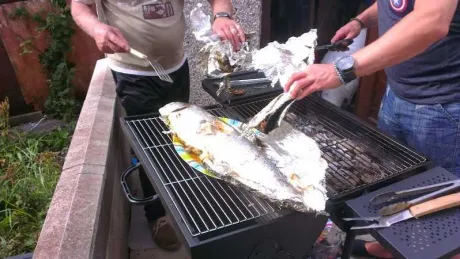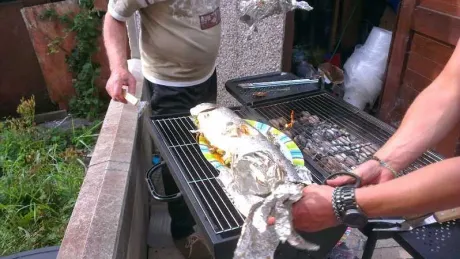 Carefully wrapped in foil, the sizzling and smells were amazing. But barbecuing a whole salmon is not a two minute task. So we enjoyed a few beers and good chat until it was time to rip the foil off and get stuck in.